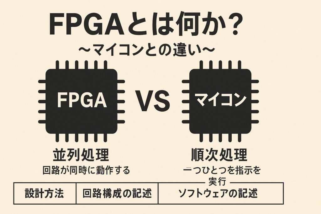 Posted on: 12月 19th, 2025 FPGAとは?その仕組みから開発ステップまで完全解説 FPGA(Field […] 第1章:FPGAとは何か?〜マイコンとの違い〜 第2章:FPGAの基本構造 第3章:FPGAの開発言語「HDL(ハードウェア記述言語)」 第4章:FPGA開発のステップバイステップ 第5章:初心者におすすめのFPGA学習環境 第6章:FPGAの未来と可能性 まとめと歴史 オーディオへの活用事例アイディア3選 kotaro