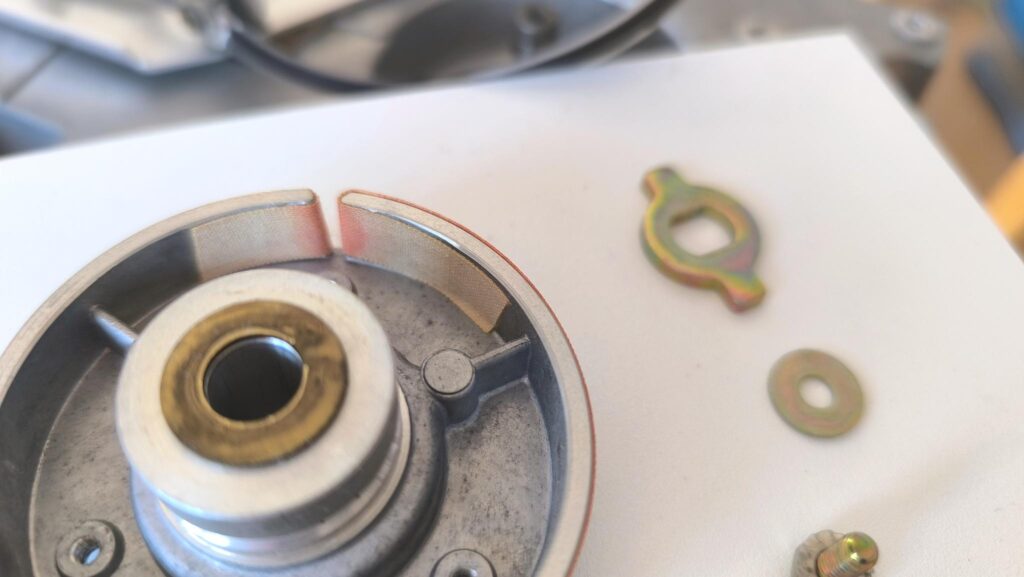 - その状態で、ブレーキドラムを「ドッグワッシャー(爪付きワッシャー)」と一緒にモーターシャフトから慎重に引き抜きます。