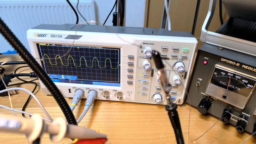 ここでチェックポイントAにて正弦波が出ている、つまり、基盤を正常な状態で実機に接続するわけですが、このシュミレーターで正常を確認というのは問題の切り分けには非常に有効なデバッグになります。