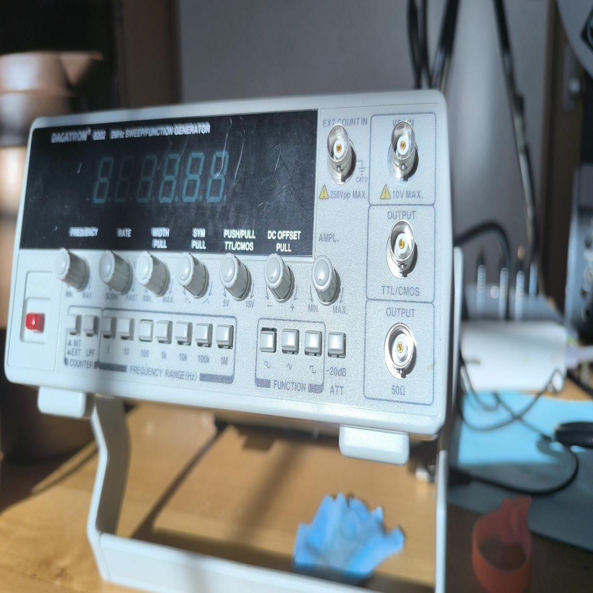 もし心配で、この基板が正常かどうかの確認方法 もしお手元のファンクションジェネレーターに「出力レベル(Amplitude)」を調整するつまみがあれば、それを絞って、信号を小さくしてみてください。