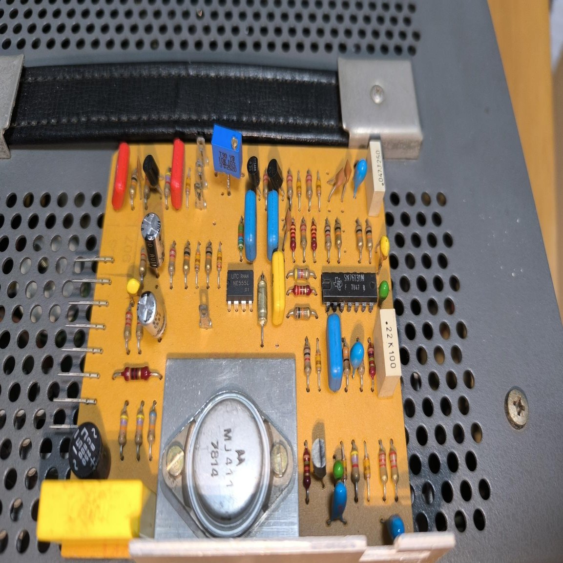 基板の左下にある一番大きなコンデンサで、オリジナルは「MP(メタライズド・ペーパー)」という紙を使ったコンデンサとなり、経年で湿気を吸い、絶縁破壊を起こして盛大に煙を吹くことで有名です。